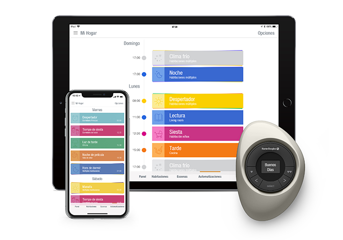 Programar tus Cortinas eléctricas según tus horarios es otro de los grandes beneficios de PowerView™, puedes escoger que tus Cortinas Roller funcionen de forma independiente o en total sincronización, para que se activen en días y horas específicas; creando escenas ideales para cada momento.