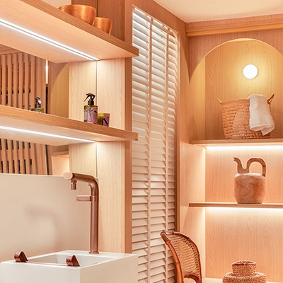 Si son de madera o de aluminio va a depender del estilo de la decoración que estás buscando, ambas opciones son un aporte al resultado. Las Persianas Country Woods con sus vetas y tonos naturales aportan muchísima calidez, y las Precious Metals combinadas con cintas decorativas, entregan elegancia.